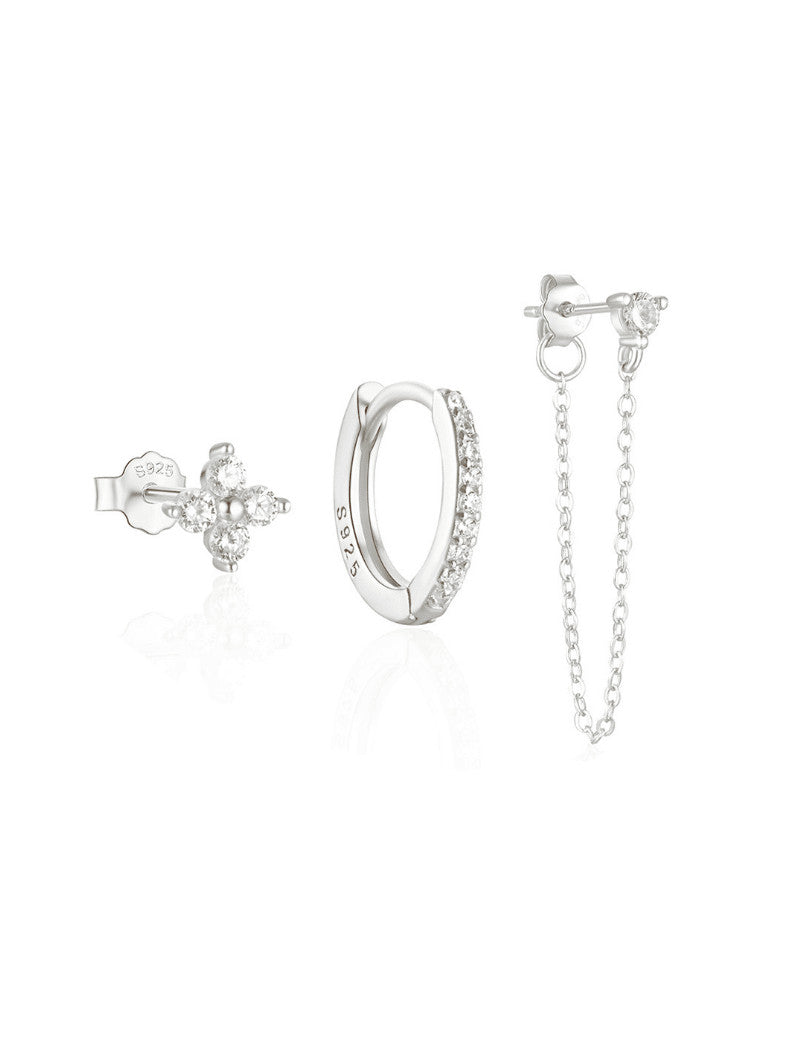 A 3-piece earring set with a flower stud, huggie and chain stud, available in sterling silver or 14K gold-plated sterling silver. Stack them or wear them separately - the choice is yours!